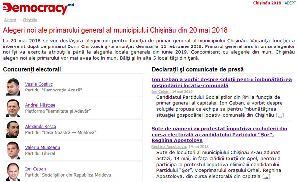 Asociaţia pentru Democraţie Participativă ADEPT a lansat pagina web dedicată alegerilor noi ale primarului general al municipiului Chişinău din 20 mai 2018 — www.alegeri.md.