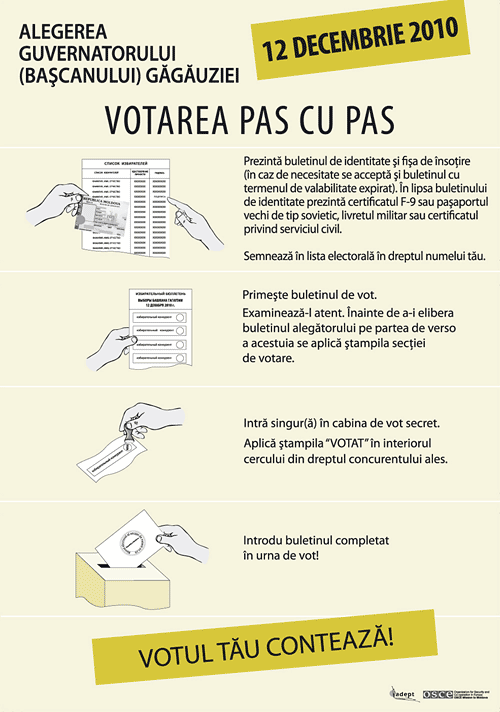 Posterul “Votarea pas cu pas” ilustrează procedura de vot. Este realizat de Asociaţia pentru Democraţie Participativă ADEPT cu suportul financiar a Misiunii OSCE în Moldova.