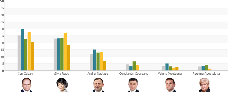 | 11.05.2018 | | 30 apr – 8 mai | 750 | ±3.0% | Centrul de Cercetări Sociologice din Moldova | 30.6% | 31.2% | 17.2% | 8.7% | 3.9% | 5.4% | 25.7% | |||