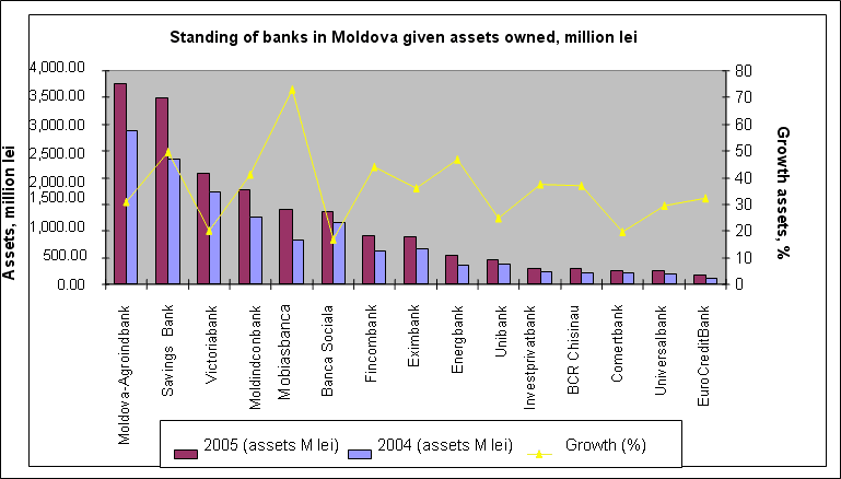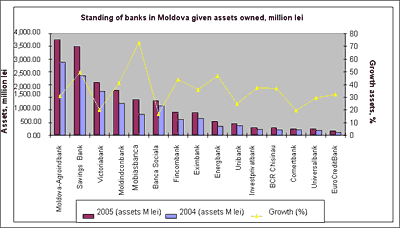 The six large banks (Moldova-Agroindbank, Savings Bank, Victoriabank, Moldindconbank, Mobiasbanca, Banca Sociala) own worth between 1 and 4 billion lei. As a rule, Moldova Agroindbank is leader regarding the size of assets, as it owns assets worth 3.7 billion lei, followed by Savings Bank - 3.4 billion lei, Victoriabank - 2.08 billion lei, etc. The rest of banks oscillate between 160 million lei and 900 million lei. Mobiasbanca posted the highest jump of assets in 2005, as they grew by 73 percent and this institution climbed from the 6th up to the 5th place in the standing of banks. The assets of Savings Bank (in which the state owns 56 percent of the majority package) also registered a spectacular rise in 2005, 49 percent, while the assets of Energbank grew by 46.8 percent (see the diagram).