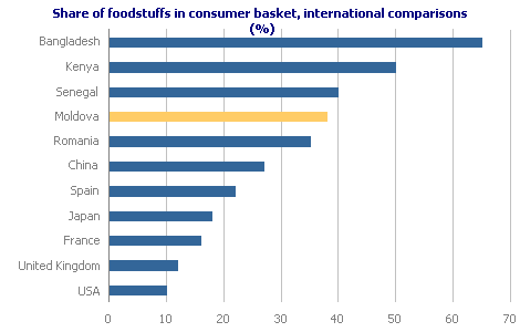The accelerated rise of food prices will advantage developed countries and developing states which are big exporters of grains and will seriously hit developing countries, especially poor urban areas which import food products. While American, British and Japanese people spend less than 20 percent of their earnings on food, residents of poor countries spend about 60 percent (foodstuffs cover between 35 and 40 percent of the consumer basket in Moldova Diagram 1).