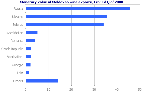 The spirits exports from Moldova have grown by 76 percent in nine months of this year, compared with the same period of 2007. According to accounts of the agro-industrial agency Moldova-Vin, exports have grown up to more than 146 million dollars, compared with 83 million dollars in 2007. The agency said that more than 86 percent of exports went to the CIS, and they were worth more than 126 million dollars (by 82 percent more than in 2007). Exports to the EU were worth more than 17 million dollars (by 42 percent more than in 2007), and Moldova exported spirits worth about 3 million dollars to other countries (by 38 percent more than in the same period of last year).