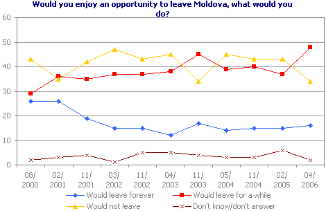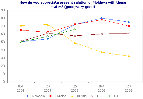 The perception of Moldova’s worse relations with Russia is the most discernible. Approximately 40 percent of citizens have noted this trend in the past two years. Accusations brought against Moldovan authorities that they have broken up with the strategic partner are not grounded after Russia had broken off with its most loyal ally — Belarus. The conduct of the Russian Federation toward CIS member states reveals that this commonwealth is provisory. The three resolutions adopted by Russia’s State Duma in February 2005, with 2–3 weeks before the parliamentary elections, were particularly addressed to Moldova, containing open threats against it. Russia has realised almost all threats by embargoing the vegetal, animal products and wines made in Moldova.