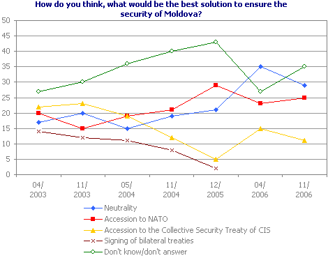 Given these relations of Moldova with the main partners from CIS, it is not surprising that the percentage of those thinking that the national security of Moldova could be ensured on basis of bilateral treaties has declined. Even more, the number of those thinking that Moldova’s accession to the Collective Security Treaty of CIS would solve security problems has significantly declined.