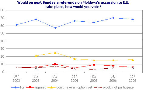 Surveys conducted the last years confirm that the E.U. integration would be the most wanted objective for Moldovan citizens. Starting 2003, when the ruling party pledged to become a promoter of European integration of Moldova, the number of Moldovan citizens who would vote this objective count constantly for between 60 and 70 percent. It is clear what Moldovan citizens would like and what the E.U. is giving us within the European Neighbourhood Policy.