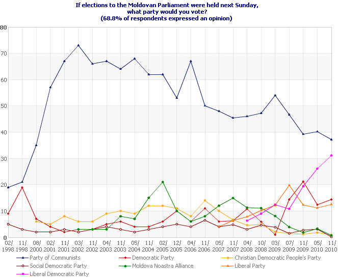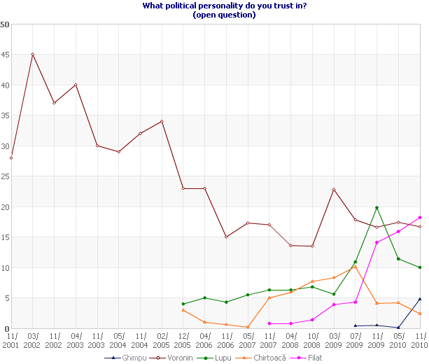 In terms of principles and values, restoring the Alliance for European Integration (AEI) by PDM, PLDM and PL seems, at first sight, preferable to the Alliance for Moldova (AM), proposed to PDM by PCRM. Indeed, PDM has been for more than a year part of AEI and there were no axiological problems. In exchange, there were severe problems of communication and unfair competition between allies. Yet, the last factor was due to the provisional nature of AEI governance, i.e. the imminence of early parliamentary elections, which made the allies to be competitors. Consequently, each party within the AEI, as well as outside of it, has strived to achieve its own interest. Even if it was so, it would be an exaggeration to believe that: the famous decrees of the interim President, Mihai Ghimpu, PL leader; involving the responsibility of Prime Minister Vlad Filat, PLDM leader, to support disadvantaged strata of the population, or the enigmatic anti-mafia campaign, directed against PDM and its leader, Marian Lupu etc. — would have had an adverse decisive effect on allies’ electoral score. All things that have poisoned the relations between the allies have occurred in June-September 2010, but the trends, reconfirmed by final election results, were already very clearly profiled in May. This is confirmed by the Public Opinion Barometer (BOP) regarding the rating of trust in political leaders.