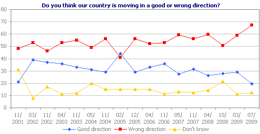 According to the Barometer of Public Opinion (BPO) poll commissioned by the Institute of Public Policy (IPP) before the early parliamentary elections, the state of things is worse in Moldova than before. As much as 67.4 percent of respondents fear that the Republic of Moldova is moving in a wrong direction and only 19.6 percent believe that the things go well. Thus, consequences of the economic crisis, which authorities assured that do not exist, hit the welfare of people.