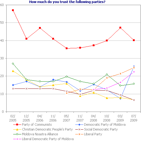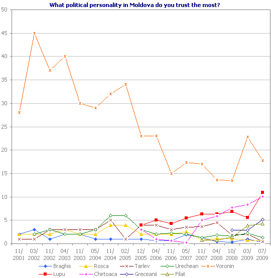 The same perception was generally projected on trust in leaders of main political parties. The trust in PCRM leader Vladimir Voronin has decreased from 23 percent before the April 5 elections down to 17 percent in July (answer to an open question).