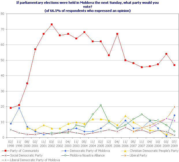 The ratings of PL and PLDM leaders Dorin Chirtoaca and Vlad Filat have easily increased, while the rating of the chairman of Moldova Noastra Alliance (AMN) has easily decreased within the margin of error (±2.6 percent). On the other hand, the rating of the new PDM leader, Marian Lupu, has increased from approximately 7 percent in March up to about 11 percent in July.