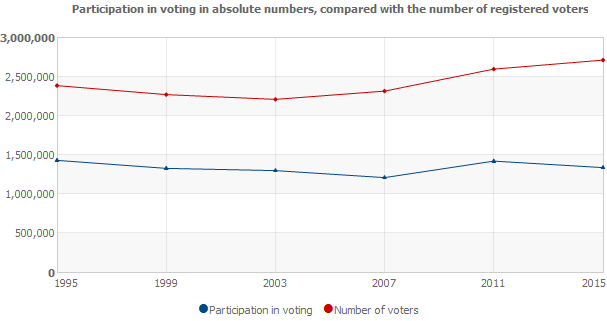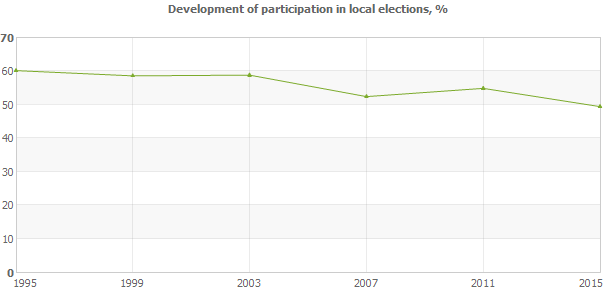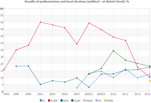 In fact, the decrease of the rate of participation is the result of changes in the registration of citizens with the right to vote. Thus, despite serious demographic problems in Moldova — decrease in birth rate, mass immigration of citizens, etc. — the number of officially registered voters is constantly growing, from ~2.3 million in 1995 to ~2.7 million in 2015. Hence the decrease in the rate of participation in the context of a relatively constant number of participants in local elections in the past 20 years — 1.4±0.1 million. So, generally, in the past 20 years the rate of participation in elections did not have a significant impact on the final results of local elections. Except in 1995, when the small rate of participation caused the invalidation of elections in Chisinau and the municipal administration was not elected, but appointed.