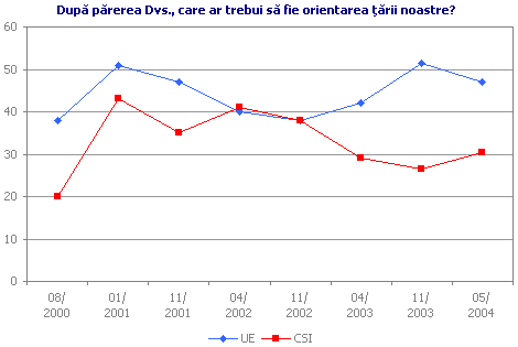 Pornind de la un grad mai mare de relevanţă a datelor BOP din ianuarie 2001 pentru măsurarea evoluţiei opţiunii europene, numărul persoanelor care au optat pentru UE în ianuarie 2001 (coloana a III-a din Tabelul 1: Guvernul Braghiş, majoritatea parlamentară a ADR fără PPCD şi Preşedinte — Petru Lucinschi) a scăzut cu 4,1% pînă în mai 2004 (ultima coloană: Guvernul Tarlev I, majoritatea parlamentară a PCRM şi Preşedinte — Vladimir Voronin). Pentru comparaţie, numărul celor care au optat pentru CSI în aceeaşi perioadă a scăzut cu 12,6%.
