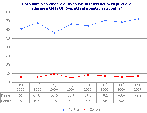Deşi BOP din mai 2004 a fost ultimul în care a figurat întrebarea referitoare la orientarea externă a Moldovei, aderenţa la ideea europeană poate fi observată şi pe baza întrebării în care respondenţii sînt chestionaţi dacă ar vota “Pentru” sau “Contra” în eventualitatea organizării unui referendum cu privire la aderarea Moldovei la UE. Această întrebare figurează începînd cu BOP din aprilie 2003 şi este reluată de BOP pînă în mai 2007, cu excepţia BOP din februarie 2005.
