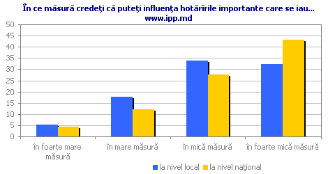 Şi numărul cetăţenilor care cred că pot influenţa deciziile autorităţilor locale este semnificativ mai mare ca numărul celor care cred că pot mai lesne influenţa deciziile la nivel naţional.
