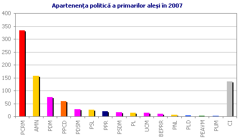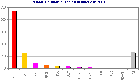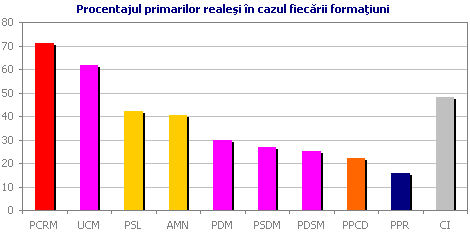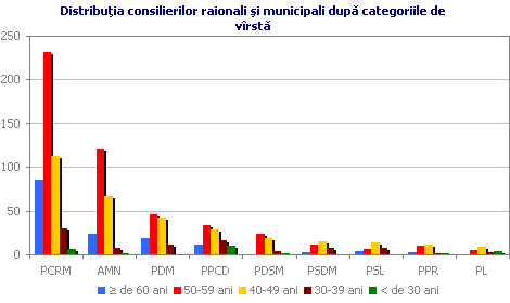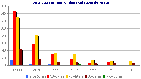 Pe de altă parte, PPCD este formaţiunea care s-a manifestat cel mai mult în promovarea candidaţilor cu vîrsta sub 30 de ani. Cu excepţia PCRM, toate celelalte partide confirmă o legitate, fiind reprezentate preponderent de primari cu vîrsta medie de 40–49 ani.