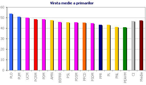 Vîrsta medie a primarilor este de 47,5 ani, iar cea a primarilor independenţi e cu puţin sub cea medie, reprezentînd 46,7 ani. Evident, acest criteriu este relevat pentru partidele cu pondere mare în viaţa politică, de aceea nu trebuie să mire că în Tabelul 5 indicatorii vîrstei medii a primarilor partidelor respective sînt flancaţi de indicatorii pentru partidele cu o reprezentare minimă.