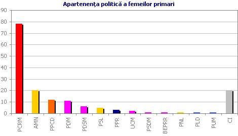 Numărul femeilor promovate de unele partide este semnificativ peste media pe ţară de 18% şi cu mult peste cota de reprezentare a femeilor primari independenţi (14,8%). Dintre partidele mari şi cele cu o anumită pondere se pare că doar PCRM, PDSM, PPCD şi PSL au politici gender de reprezentare în organele elective. Ţinînd cont de faptul că femeile deţin o cotă de 52% din alegătorii moldoveni, precum şi de tendinţa echilibrării reprezentării în organele elective pe criterii gender, partidele menţionate ar putea beneficia pe termen lung de pe urma practicilor aplicate în prezent. Dintre partidele cu reprezentare semnificativă doar AMN are o reprezentare sub cea medie a femeilor în funcţiile de primari.