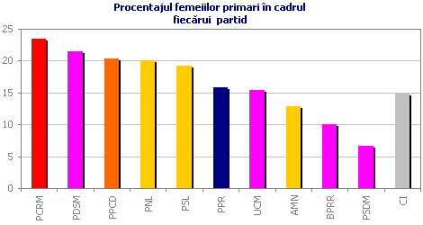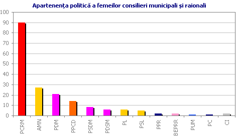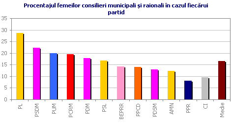 În general, este meritul partidelor că reprezentarea femeilor în Parlament — 20%, în primării — 18%, şi în consiliile raionale şi municipale — 16,5%, este conformă mediei europene. Deşi sînt evidente progresele în promovarea femeilor, totuşi nu se poate vorbi încă de politici bine chibzuite în acest sens. Reprezentarea femeilor consilieri în cele două municipii — Bălţi şi Chişinău, cu statut de unităţi administrativ-teritoriale de nivelul II, se deosebeşte cardinal. În municipiul Bălţi reprezentarea femeilor consilieri este de 14,3% — sub media pe ţară, iar în municipiul Chişinău reprezentarea femeilor consilieri este cea mai înaltă — 1/3. În Chişinău, performanţa se datorează celei de a doua fracţiuni din consiliul municipal Chişinăului — cea a PL, care este reprezentat în proporţie de peste 50% de femei. În general, după cum se vede din Tabelul 23, PL are cel mai înalt procentaj pe ţară de reprezentare a femeilor în consiliile raionale şi municipale.