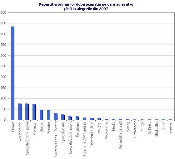 Un alt lucru important de remarcat este că pe locul doi în topul ocupaţiei foştilor primari se află activitatea de antreprenor (conducători de SRL-uri, societăţi pe acţiuni şi întreprinderi individuale). Cifra absolută de doar 75 de primari foşti antreprenori (6,7%) nu trebuie să înşele. Din cei 435 de primari aleşi în 2003 şi realeşi în 2007, activitatea de antreprenor o practica un procentaj foarte înalt. În acest sens, merită remarcat faptul că toţi antreprenorii deveniţi primari în 2003 au trebuit să-şi sisteze activităţile în conformitate cu legislaţia, lăsîndu-le, de fapt, pe seama apropiaţilor.
