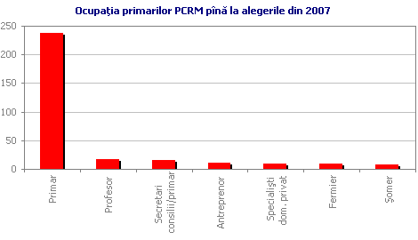 Remarcile de mai sus se confirmă implicit dacă examinăm separat distribuţia după criteriul ocupaţiei a primaţilor aleşi din partea PCRM şi a celor aleşi din partea opoziţiei. Din Tabelul 13 vedem că în cazul PCRM categoria primarilor, foşti antreprenori, se află pe locul patru fiind devansată de categoria profesorilor, care în cazul PCRM sînt de cele mai multe ori directori de gimnazii şi licee cu o mare influenţă asupra comunităţilor şi de cea a secretarilor primării şi ai consiliilor locale, care la fel sînt foarte influenţi în localităţi.