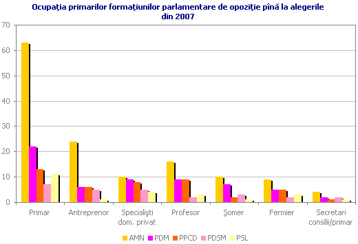 În cazul opoziţiei per ansamblu categoria primarilor foşti antreprenori este în top imediat după categoria primarilor realeşi. Luînd în consideraţie remarcile de mai sus putem afirma că distribuţia primarilor după criteriul ocupaţiei, alături de distribuţia după criteriul educaţiei, confirmă faptul că aderenţii principalilor partide politice, promovaţi în funcţii publice, nu reprezintă pături sau segmente sociale distincte, cu viziuni deosebite. Apartenenţa doctrinară este un criteriu valoric doar pentru grupurile de iniţiativă care fondează partidele şi elitele acestora. În rest, membrii partidelor din teritorii, distribuiţi pe grupuri sociale, sînt reprezentaţi relativ uniform, practic, în cazul tuturor partidelor. Această concluzie elucidează curiozitatea din 2003, cînd actualul partid de guvernămît s-a declarat “partid al poporului”. Într-adevăr, de ce să n-o facă din falsă modestie dacă nu reprezintă vreun segment social anume, dar are cel mai înalt rating şi pretinde că-i reprezintă pe toţi, dea valma?