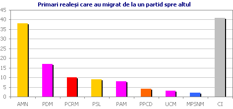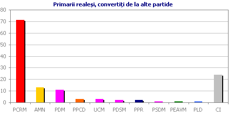Evident, cel mai mare succes în convertirea primarilor oponenţilor politici (Tabelul 16) l-a avut partidul de guvernămînt. PCRM a reuşit să convertească 71 de primari realeşi (30%), dintre care doar 27 (11,2%) din cei foşti independenţi.