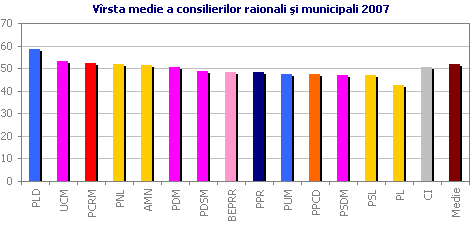 Vîrsta medie a consilierilor raionali este 51,7 ani, cu patru ani mai mare decît cea a primarilor. Tabelul 20 evidenţiază că dintre partidele cu o anumită pondere PCRM şi PL se află la polii mediei de vîrstă a consilierilor.