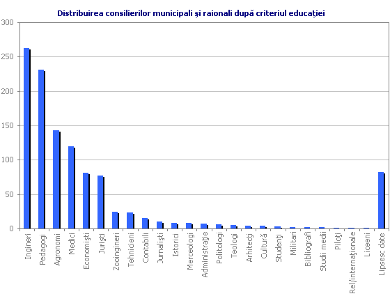 Cum aproximativ 90% din consilierii aleşi şi-au primit instruirea profesională în perioada sovietică, la fel ca şi în cazul primarilor, distribuirea lor după criteriul educaţiei reflectă o anumită realitate legată de profilul economic şi politicile de pregătire a cadrelor din perioada respectivă. Din Tabelul 24, comparat cu Tabelul 9, se observă anumite diferenţe în distribuţia după educaţie a consilierilor, faţă de cazul primarilor, lucru care poate fi, mai degrabă, intuit, decît stabilit în baza unor date bine determinate. O explicaţie mai credibilă poate fi oferită de compararea datelor referitoare la educaţie şi ocupaţie, lucru care va fi efectuat la rubrica distribuţiei după ocupaţie (tabelul 26).