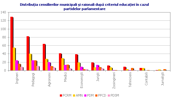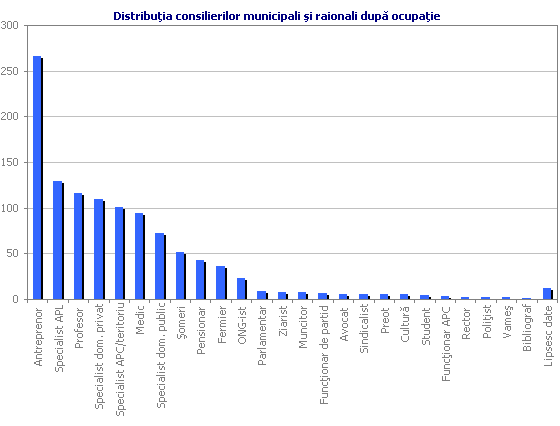 Un alt lucru demn de menţionat este că profesorii şi medicii, preponderent directorii de şcoli şi şefii de spitale, au o cotă de reprezentare semnificativă în consiliile raionale şi municipale. Faptul că reprezentarea profesorilor şi medicilor este proporţională din punctul de vedere al afilierii politice indică asupra unor atitudini similare faţă de învăţămînt şi ocrotirea sănătăţii din partea tuturor formaţiunilor politice influente. Totuşi, dacă profesorii sînt, mai mult sau mau puţin, reprezentaţi uniform între primari şi consilieri, atunci medicii sînt reprezentaţi preponderent printre consilieri, ocupaţia respectivă neadmiţînd întreruperi de durată.