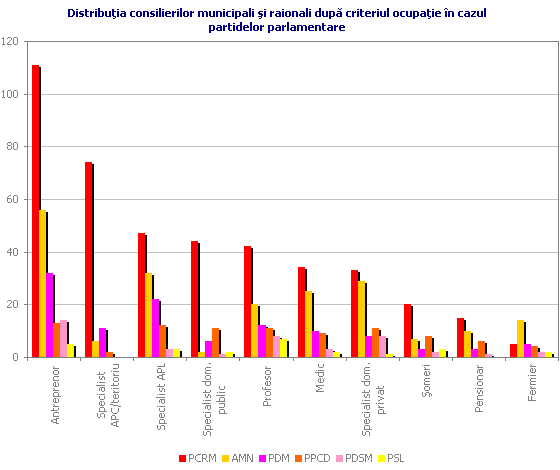 Tabelul 27 relevă distribuţia consilierilor după ocupaţie în cazul partidelor parlamentare. Este curios că în cazul PCRM cota antreprenorilor este cu puţin peste media pentru această categorie, la fel ca şi în cazul AMN şi PD. În general, este foarte curios că aproximativ 42% din toţi consilierii antreprenori (sau viceversa) sînt aleşi din partea PCRM. Din acest punct de vedere, acuzaţiile reciproce ale partidului de guvernămînt şi ale celor din opoziţie, referitoare la tentativele de “cumpărare” a unor consilieri independenţi sau reprezentînd partidele mici, sau chiar convertirea “inamicilor” politici pentru formarea coaliţiilor majoritare în raioane, nu sînt lipsite de temei. S-ar putea ca consilierii antreprenori, din considerente de “eficienţă”, să fi recurs la astfel de artificii şi fără consultarea liderilor de partide. Oricum, scandalurile legate de “cumpărarea voturilor” consilierilor ar trebui să dea de gîndit.