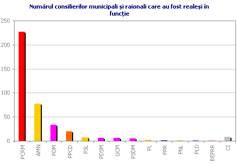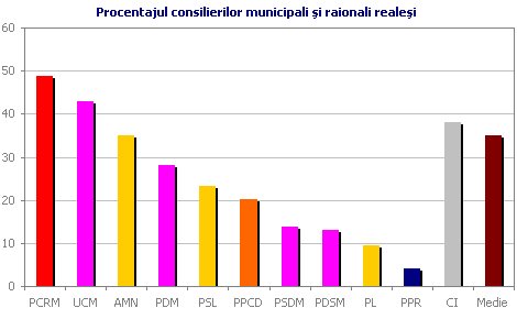 Tabelul 29 relevă că procentajul consilierilor realeşi reprezintă o cotă de aproximativ 35%, ceea ce, conform datelor anterioare, este caracteristic, atît pentru consiliile locale, cît şi pentru Parlamentul Republicii Moldova. La fel ca şi în cazul primarilor, PCRM are cel mai înalt procentaj de consilieri realeşi, însă coaliţiile democratice raionale, formate din celelalte formaţiuni, practic, pot concura cu PCRM în ceea ce priveşte experienţa anterioara a consilierilor.