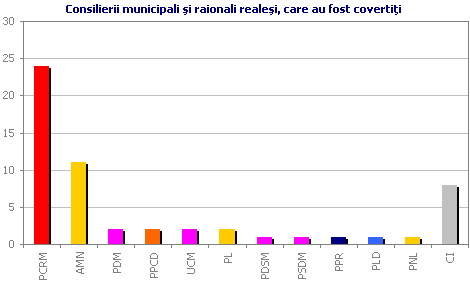 Migraţia politică a consilierilor realeşi permite o estimare generală a fenomenului migraţiei politice. Astfel, din cei 1122 de consilieri, 395 (35,2%) au deţinut funcţii de consilieri şi în perioada anterioară. Procentajul migraţiei politice printre consilieri a constituit 14%, fiind de două ori mai mic decît în cazul primarilor. Aceasta, probabil, se explică prin faptul că primarii resimt mult mai puternic influenţa din partea partidelor competitoare, mai ales a celui de guvernămînt. Precum era de aşteptat, şi în cazul consilierilor, PCRM a fost cel mai activ în convertirea consilierilor oponenţilor politici, dar şi a celor independenţi. Totuşi, partidele de opoziţie, mai cu seamă principalul rival al Partidului Comuniştilor — AMN, nu ar fi în drept să se plîngă, dat fiind faptul că au procedat, practic, la fel. Dacă în cazul primarilor, raportul celor convertiţi a fost de 5 — 6 la unu în favoarea PCRM, atunci în cazul consilierilor raionali/municipali raportul este de 2:1 (vezi Tabelul 30), ceea ce corespunde întocmai rating-ului electoral al PCRM şi AMN.