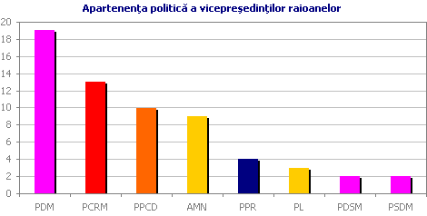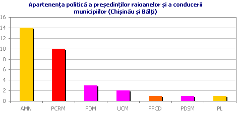Tabelul 33 pune în evidenţă apartenenţa politică a preşedinţilor raioanelor şi a conducerii municipiilor Chişinău şi Bălţi. Presiunile vizibile pe care le exercită PCRM asupra coaliţiilor majoritare din raioane şi municipiul Chişinău sînt de două feluri: presiuni financiare, lucru care se întrevede clar în proiectul legii bugetului pentru anul 2008 şi care este contestat mai cu seamă de AMN, care deţine conducerea majorităţii relative a raioanelor; presiuni informaţionale îndreptate spre defăimarea liderilor formaţiunilor de opoziţie, preponderent a liderilor PL, aflaţi la cîrma municipiului Chişinău. Este adevărat că liderii partidelor de opoziţie au oferit pretexte cu duiumul pentru a fi ridiculizaţi copios de către maşina propagandistică a PCRM. Dacă opoziţia ar şti să înveţe măcar pe propriile greşeli, trăgînd concluzii din cele întîmplate pentru a evita să se expună propagandei năucitoare a PCRM (măcăr către alegerile din 2009), atunci ar trebui să fie mulţumită acestei maşini propagandistice că şi-a început atacurile de pe acum.