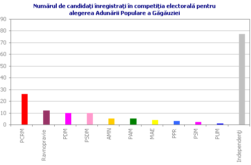 În total, în competiţia electorală pentru AP s-au înscris 160 de candidaţi, dintre care cinci s-au retras. Aproximativ o jumătate din candidaţi au reprezentat zece partide politice naţionale, iar cealaltă jumătate a fost constituită din candidaţii independenţi. În general, trebuie menţionat faptul că în Găgăguzia, exceptînd cazul PCRM, apartenenţa politică a celorlalţi candidaţilor la funcţia de deputat în AP este puţin relevantă.