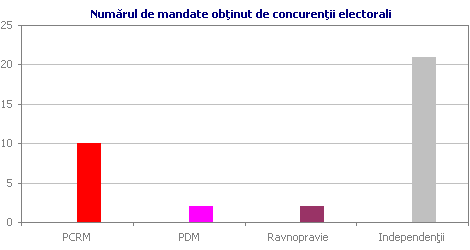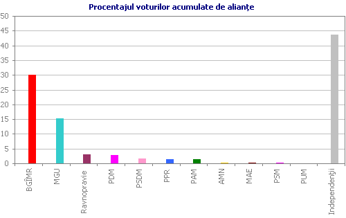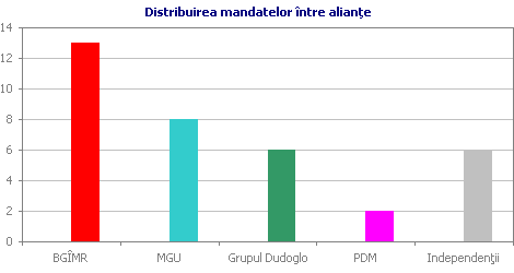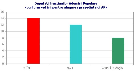 Rezultatul votării pentru candidaturile propuse la preşedinţia AP a produs o adevărată senzaţie. Din cei 17 deputaţi anunţaţi ca membri ai coaliţiei lărgite a BGÎMR au votat în secret pentru candidatura PCRM, Demian Caraseni, doar 14 persoane. Candidatul MGU, Serghei Cernev a acumulat 12 voturi, iar Nicolae Dudoglo — 8. În aceiaşi zi, în al doilea tur Caraseni a acumulat 15 voturi, Cernev — 13, iar 6 buletine au fost declarate nevalabile. Aceste rezultate ne permit să evaluăm adevărata componenţă a celor trei fracţiuni din AP. Surpriza este că din cei cinci candidaţi independenţi neafiliaţi patru au fost atraşi de MGU, deşi trei din ei fac parte din grupul celor 17 care au semnat apelul PCRM către alegători. Grupul primarului Dudoglo este cu adevărat constituit din 6 deputaţi, care în cel de al doilea tur şi-au invalidat buletinele pentru a nu permite nici uneia din cele două forţe să învingă, adică pentru a-şi menţine liderul în joc. Putem presupune că cei doi deputaţi din partea Partidului Democrat în primul tur de alegeri a preşedintelui AP au aderat la grupul Dudoglo, iar în cel de al doilea tur au votat în mod diferit. Ultima presupunere pare a fi rezonabilă prin prisma rumorilor despre relaţiile de parteneriat dintre primarul Dudoglo şi PDM.