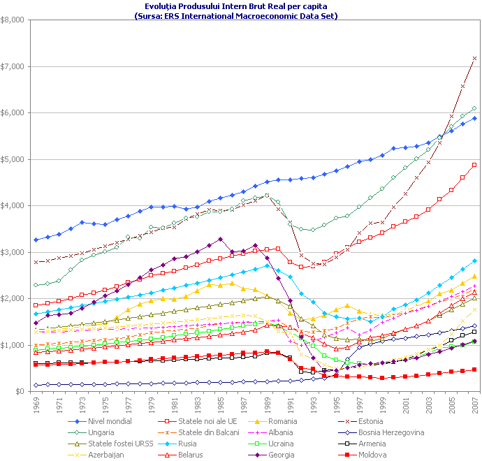 În condiţiile menţionate, orice guvernare, de orice culoare, ar fi trebuit să fie foarte rău intenţionată faţă de propria ţara şi popor ca să nu realizeze o creştere economică conjuncturală. Cu toate acestea, în perioada 2001–2008, Republica Moldova a rămas să fie cea mai săracă ţară din Europa, fiind incapabilă să micşoreze decalajul ce o desparte de ceilalţi codaşi. Ba dimpotrivă, decalajul se accentuează vizibil în continuare. Tabelul de mai jos relevă că, de fapt, încă de pe vremurile cînd era provincie agrară a URSS, Moldova era programată pentru un colaps economic în eventualitatea unei dezvoltări independente, lucru care a survenit în 1991. Predecesorii PCRM, cu toate erorile pe care le-au comis, cel puţin şi-au asumat riscurile promovării unor reforme profunde, iar PCRM a venind la guvernare după ce cele mai dureroase reforme fusese deja realizate, iar conjunctura economică regională se îmbunătăţise cardinal.