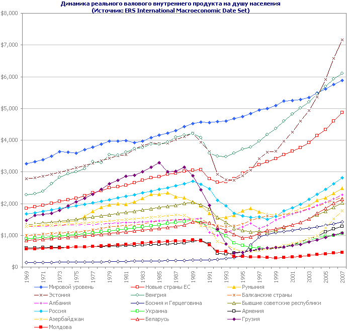 При таких условиях любое руководство независимо от политической окраски должно крайне плохо относиться к собственной стране и собственному народу, чтобы не добиваться конъюнктурного экономического роста. Вместе с тем, в 2001–2008 годах Республика Молдова оставалась самой бедной страной Европы; она не смогла сократить разрыв, отделяющей ее от остальных отстающих государств. Наоборот, этот разрыв только усугубился. Представленная ниже таблица показывает, что, по сути, еще с тех пор как она была аграрной провинцией СССР, Молдова была запрограммирована на экономический коллапс на случай возможного независимого развития, что и произошло в 1991 году. Предшественники ПКРМ, несмотря на все допущенные ошибки, по крайней мере, брали на себя ответственность за возможные риски проведения серьезных реформ, а ПКРМ пришла к власти, когда наиболее болезненные реформы уже были внедрены, а региональная экономическая конъюнктура значительно улучшилась.